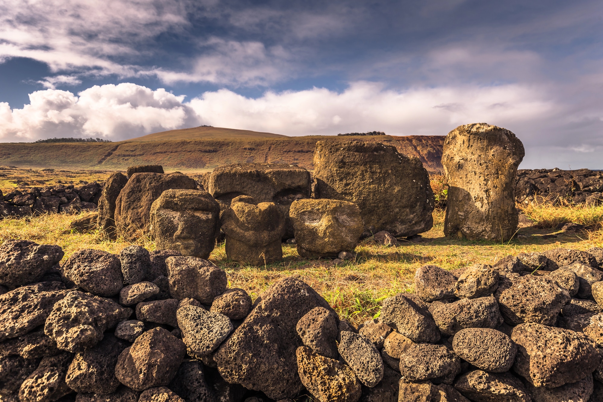 محجر في جزيرة إيستر يحتوي على تماثيل في مراحل بناء مختلفة.