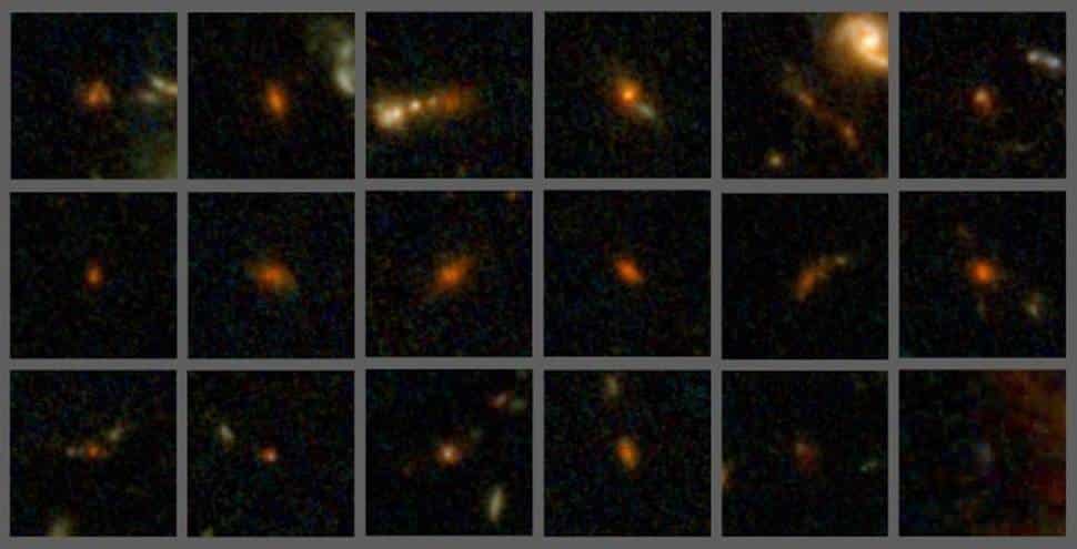 تشكلت 18 من مجرات الغبار النجمية المكتشفة حديثًا (باللون الأحمر) قبل حوالي 13 مليار سنة. حقوق الصورة: جامعة ماساتشوستس أمهيرست