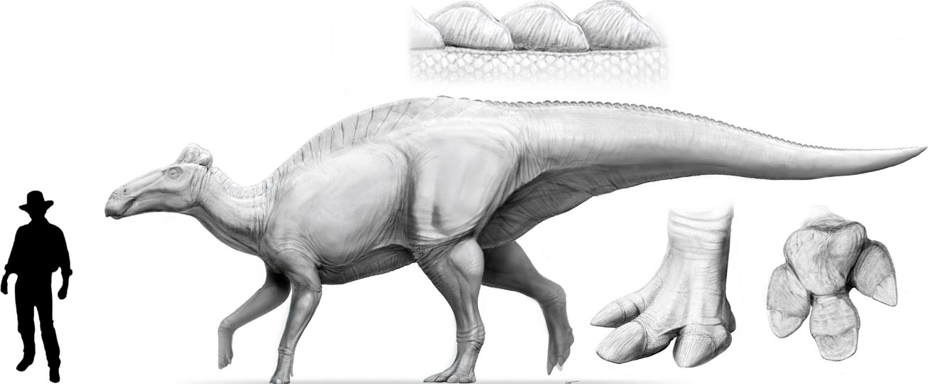 رسم توضيحي لديناصور إدمونتوصور أنكتينوس، طوله حوالي ١٣ مترًا وارتفاعه حوالي ١.٨ متر. حقوق الصورة: داني نافارو