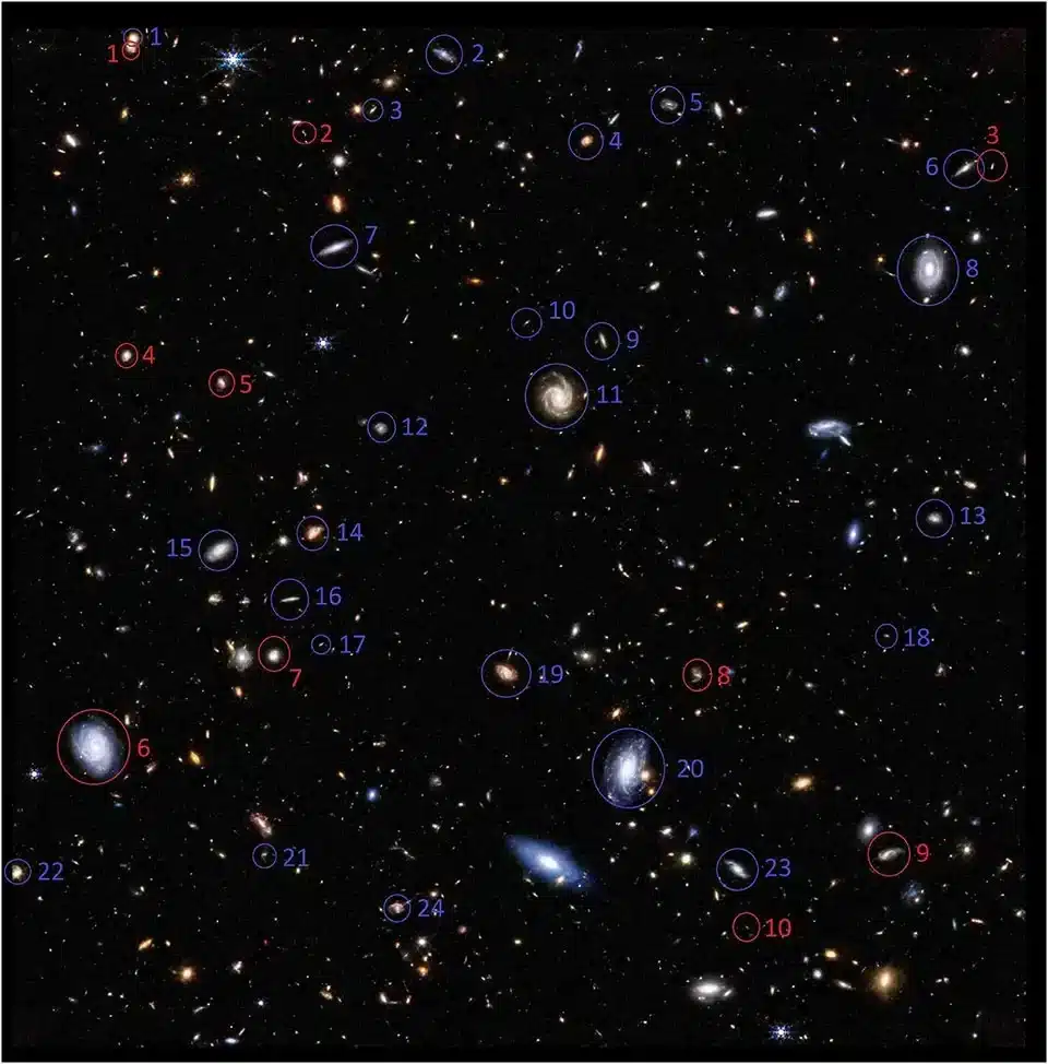 مجرات حلزونية تم تصويرها بواسطة تلسكوب ويب تدور في نفس الاتجاه بالنسبة لمجرة درب التبانة (باللون الأحمر) وفي الاتجاه المعاكس (باللون الأزرق). حقوق النشر: شامير، ليور، الإشعارات الشهرية للجمعية الفلكية الملكية، 2025 بموجب ترخيص CC BY 4.0