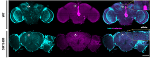 صورة مجهرية: في الصف العلوي - صورة لدماغ ذبابة طبيعية، وفي الصف السفلي - دماغ ذبابة مصابة بالتنكس العصبي، يظهر ثقوبًا في الدماغ. حقوق الصورة: شاي كلوكسي-