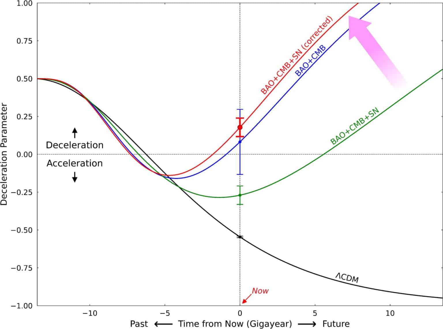 مخطط "بقايا هابل" قبل (أعلى) وبعد (أسفل) تصحيح انحياز العمر. بعد التصحيح، لم تعد مجموعة البيانات تدعم نموذج ΛCDM (الخط الأحمر مع الثابت الكوني)، ولكنها أكثر ملاءمة لنموذج الطاقة المظلمة المتغيرة بمرور الوقت، والذي يُفضله تحليل BAO فقط أو BAO+CMB (الخط الأزرق). حقوق الصورة: سون وآخرون.
